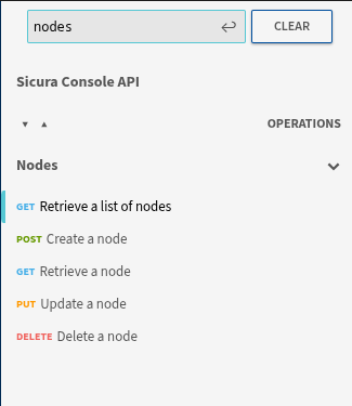 Provided is a list of every API Collection that is defined in our REST framework. By clicking one it will show you ALL of the operations that can be made on that collection. For this example we’ll show the most complex API: infrastructure/v1/nodes