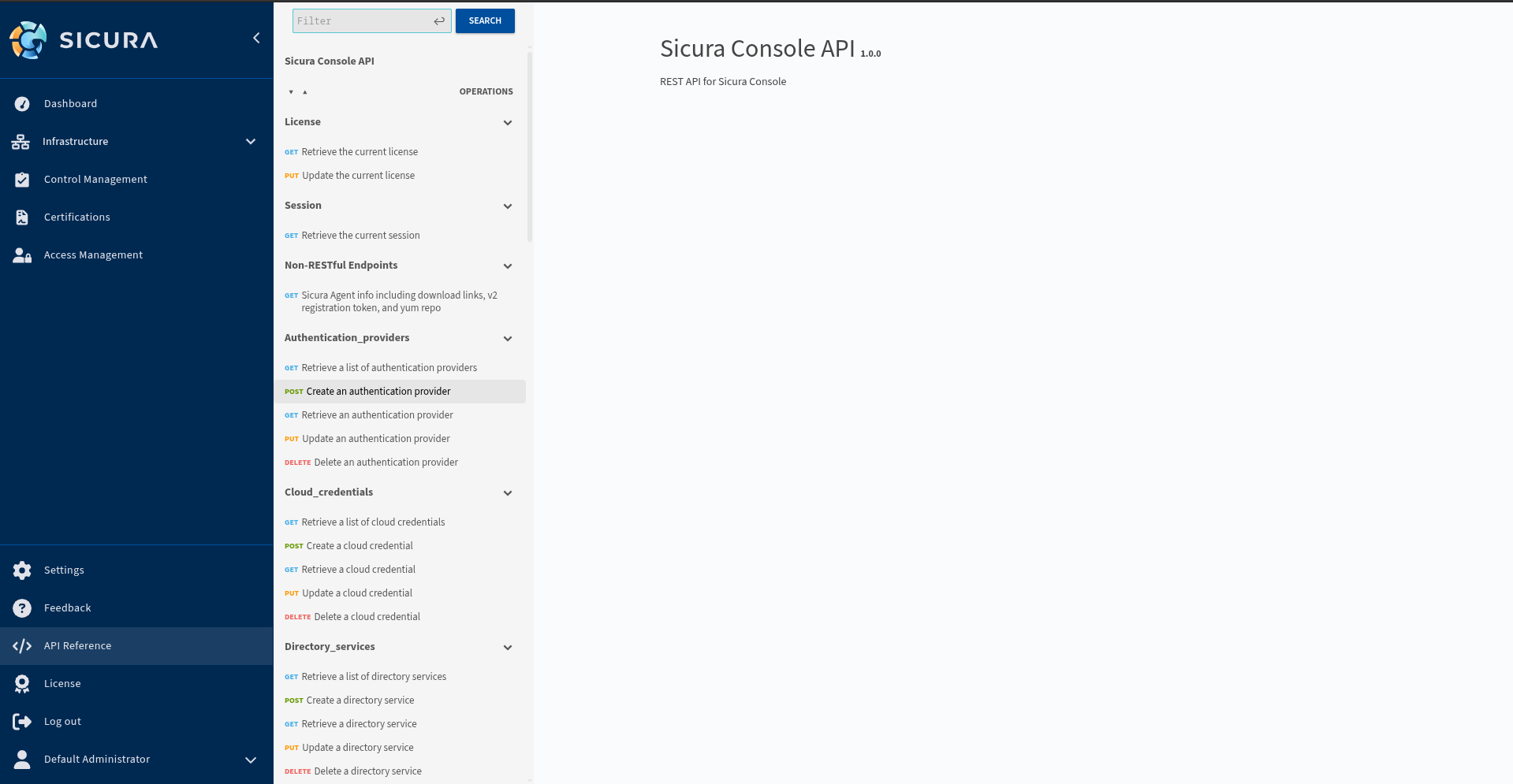 Sicura Console provides a robust backend with a thorough API that allows for easy access and manipulation of any data used in the Console. This page gives an overview of how to access and make use of the available APIs.