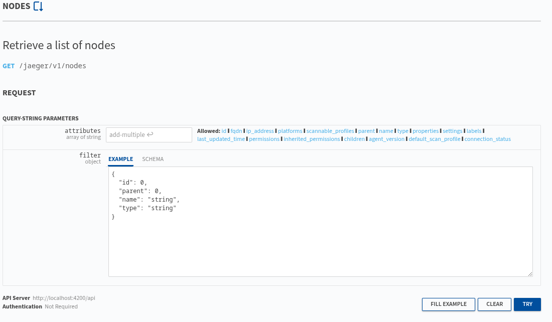 Provided is a list of every API Collection that is defined in our REST framework. By clicking one it will show you ALL of the operations that can be made on that collection. For this example we’ll show the most complex API: infrastructure/v1/nodes