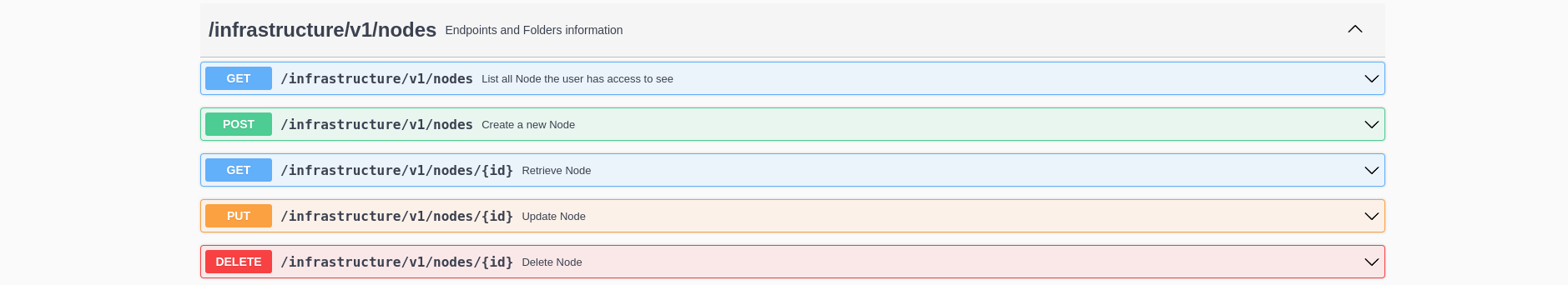 Provided is a list of every API Collection that is defined in our REST framework. By clicking one it will show you ALL of the operations that can be made on that collection. For this example we’ll show the most complex API: infrastructure/v1/nodes
