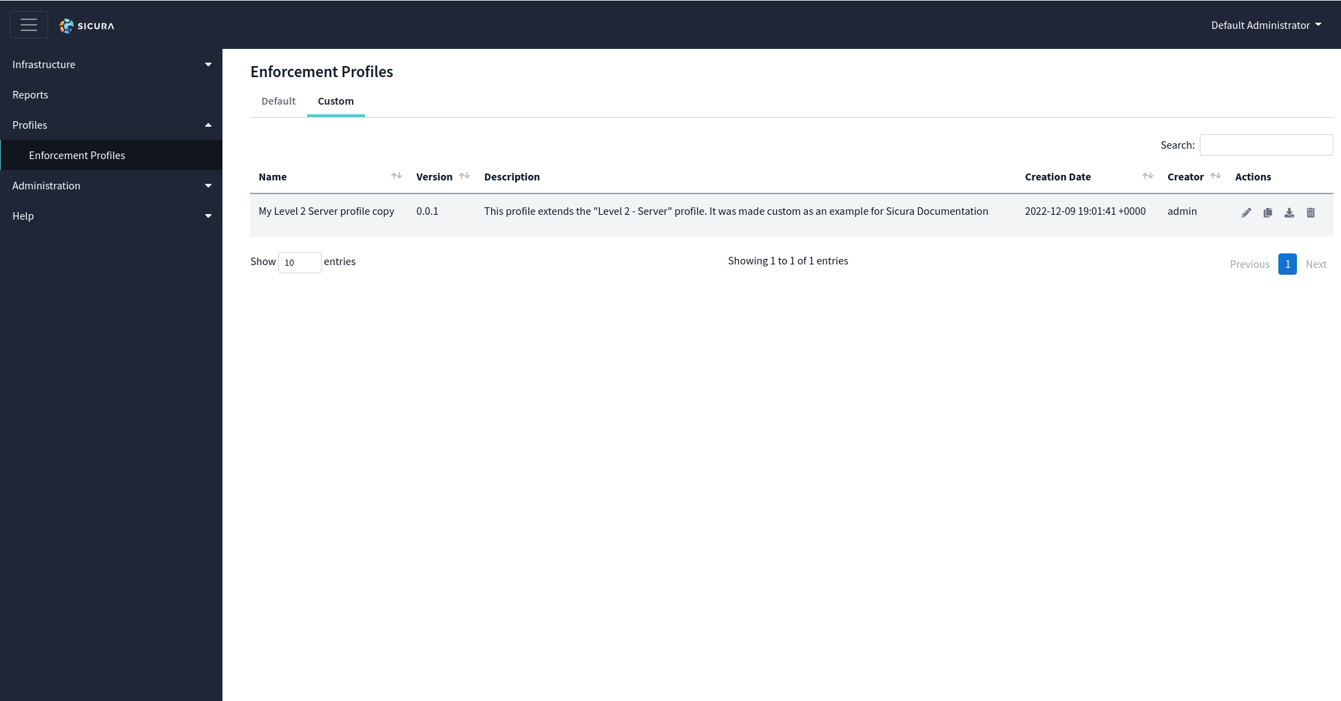 Each profile is listed as an entry in the datatable. In the case you’d like to take a profile and create a custom one from it. Simply click the copy button on the Actions column.