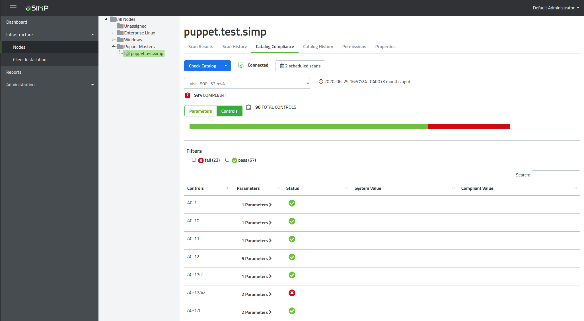 The Catalog Compliance tab provides an overview of your current catalog as reported from a SIMP server using SIMP Compliance Engine and the ‘compliance-engine’ scanner type on the SIMP Scanner.