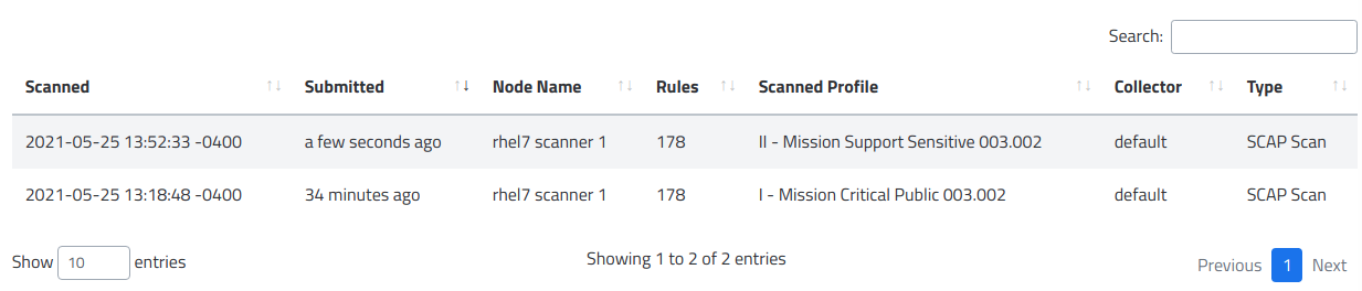 The Scan History tab provides a quick way to view the past scans done on a node (or nested nodes in the case of a folder/server). It provides information specific to date/time of scan and submission, what node the scan was done for, how many rules were checked in the scan result, what compliance profile the scan was done against, and what collector it was submitted to.