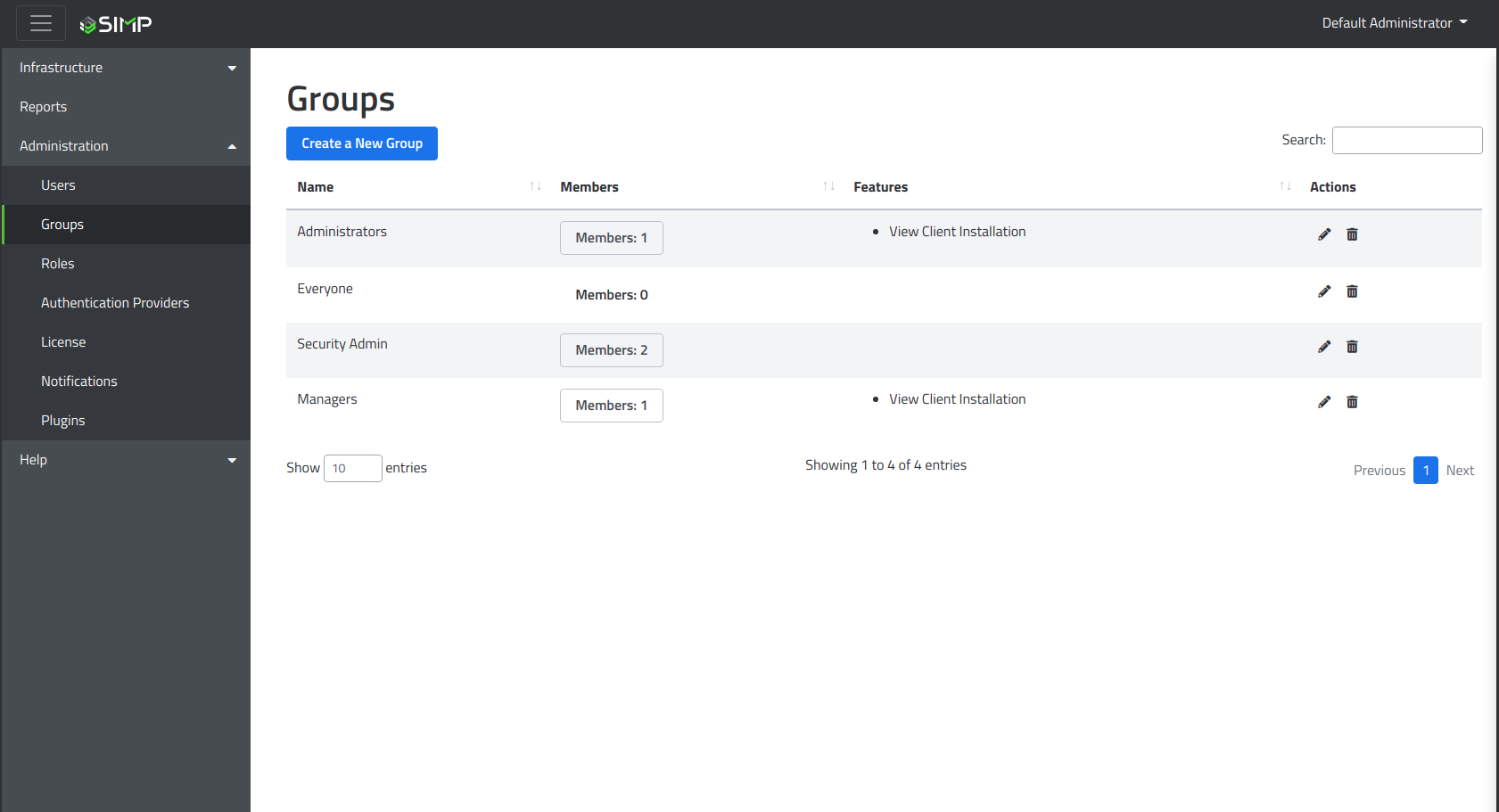 The Groups page allows administration to create/delete groups that the users can be added to. Groups allow permissions to be set for many users at once, instead of having to assign permissions on a per-user basis inside of infrastructure-nodes.