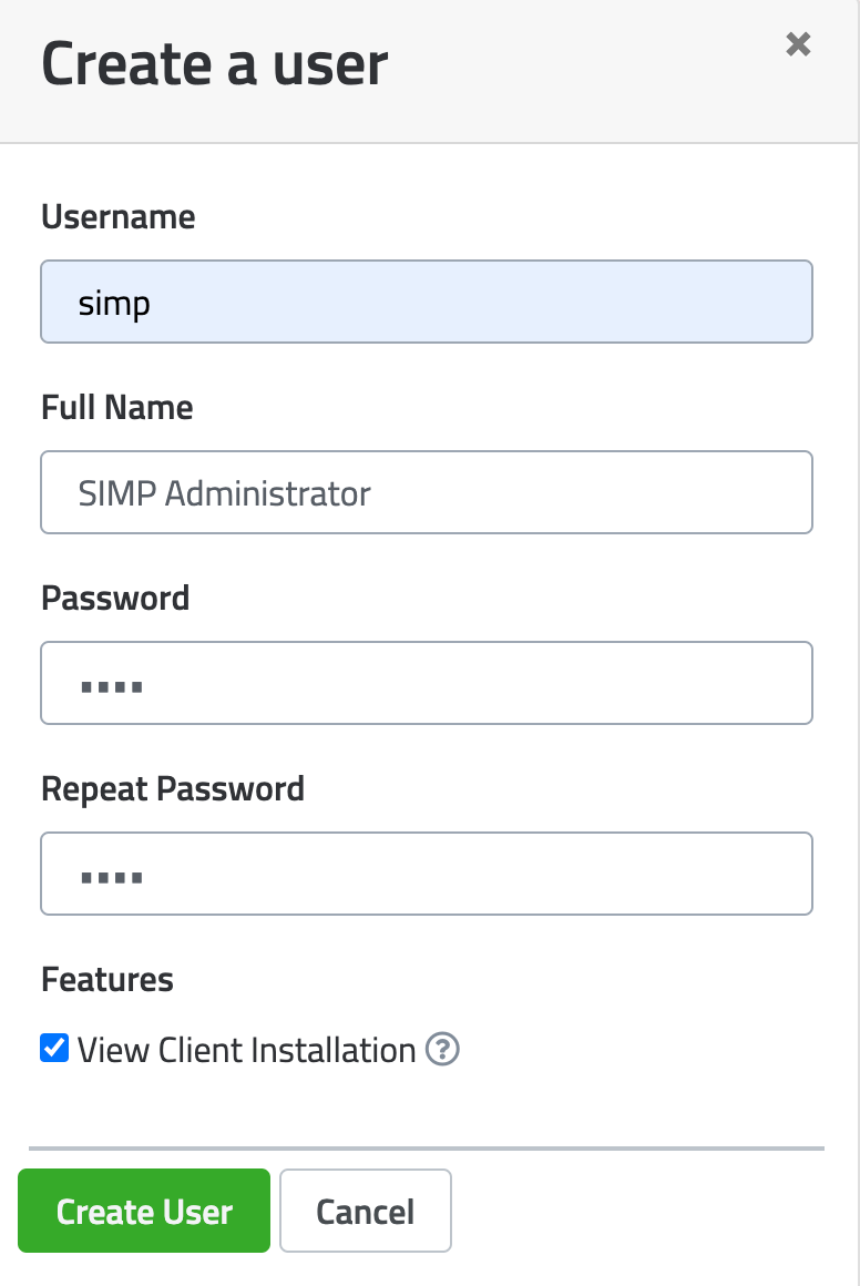 The Users page allows administration to add/remove/manage all the user accounts found within the SIMP Console. To create a new user, clicking the “Create a New User” button will bring up the user creation drawer. Enter the information as needed and click “Create User”.