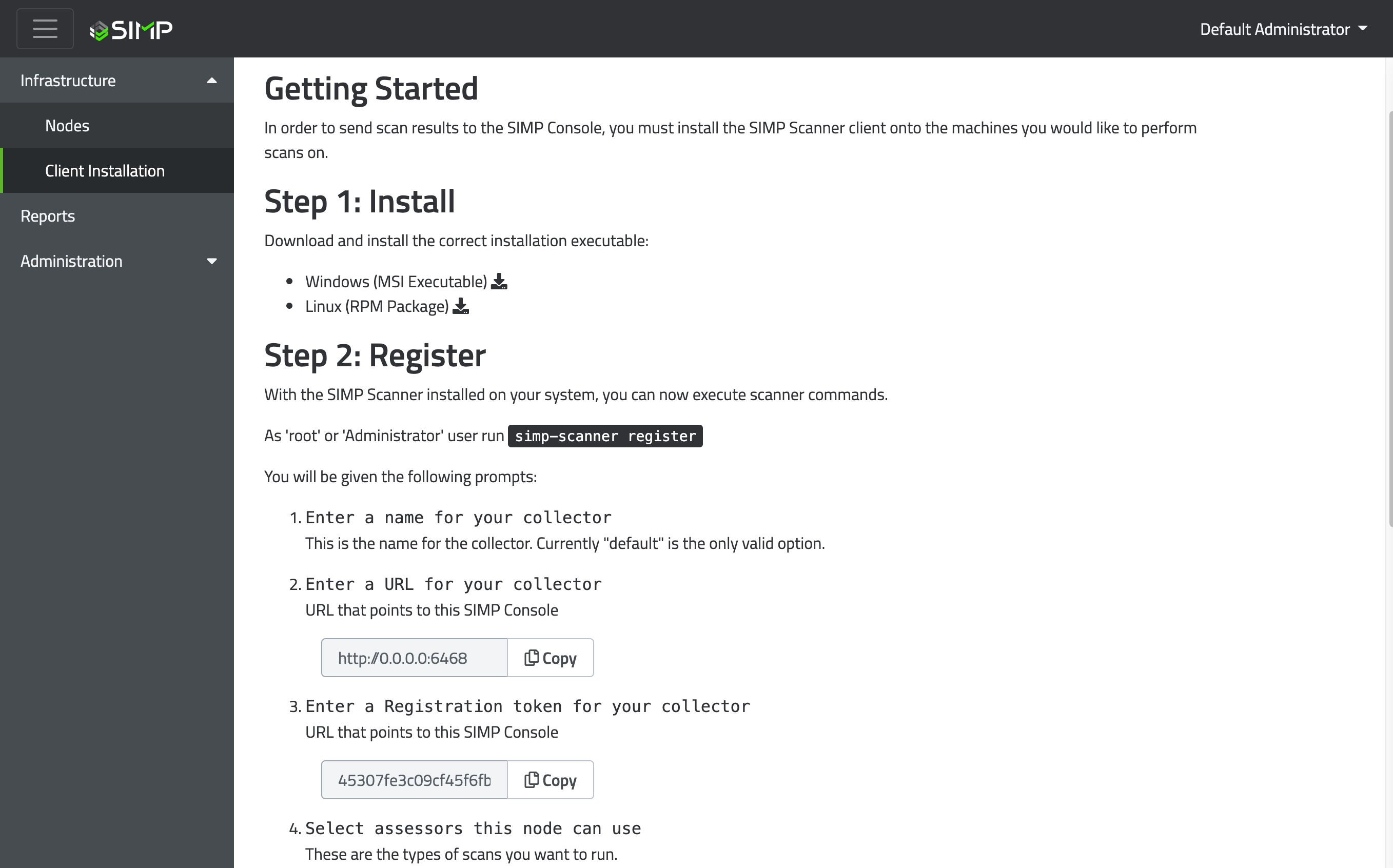 The Client Installation page is the gateway to the SIMP Agent. From here you can find links to the SIMP Agent binaries, as well as all the information needed to get nodes registered to your console. For more information on registering a SIMP Agent, see the simp-agent register page.