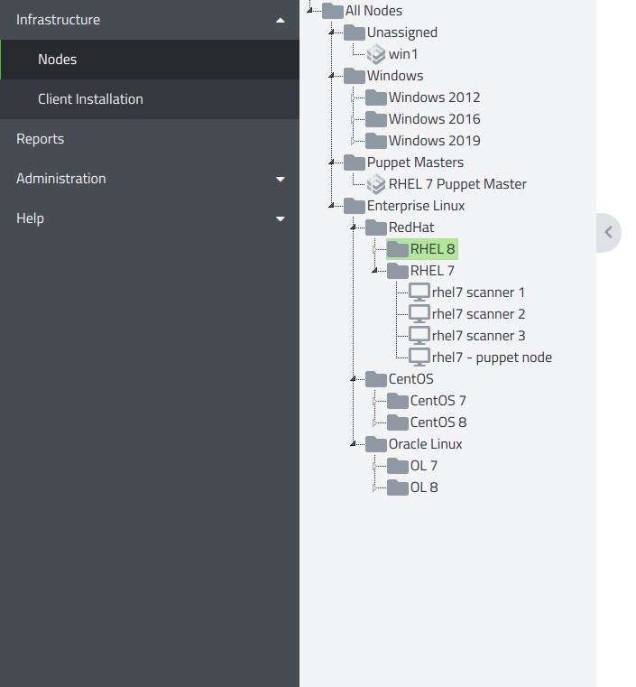 The nodes tree allows you to organize your infrastructure any way you like. Each system that has been registered to the console appears here as a node.