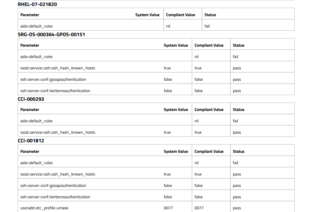 When generating a report sorted by Sicura parameter instead of controls, the report generated will output data as follows:
